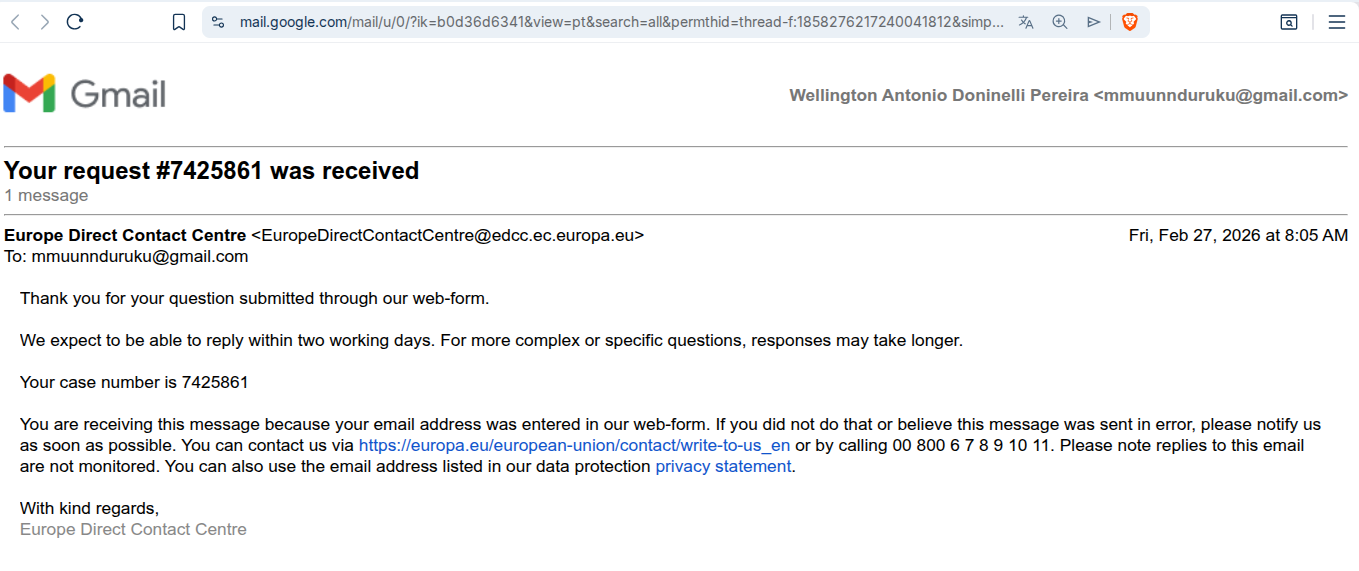 You are receiving this message because your email address was entered in our web-form. If you did not do that or believe this message was sent in error, please notify us as soon as possible. You can contact us via https://europa.eu/european-union/contact/write-to-us_en or by calling 00 800 6 7 8 9 10 11.