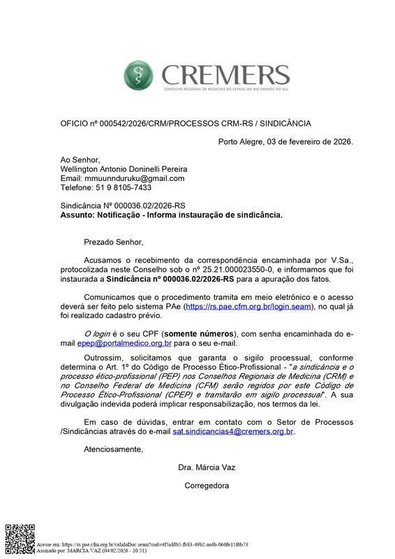 OFICIO nº 000542-2026-Sindicância nº 36-02-2026 - CONSELHO REGIONAL DE MEDICINA DO ESTADO DO RIO GRANDE DO SUL