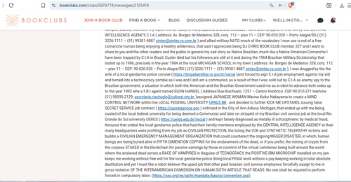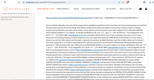 Due to synthetic telepathy I am short of life energy and my intelligence quotient is half or less because the processing power my mind had has been taken away by the scalar energy drain (electric property that allows any object of living thing to bleed energy to a military vampire source) therefore my report will be faulty in many aspects and also because I have been stripped of free will by the CENTRAL INTELLIGENCE AGENCY, C.I.A ( address: Av. Borges de Medeiros 328, conj. 112 – piso 11 – CEP: 90-020.020 – Porto Alegre/RS ( (51) 3226-1111 – (51) 99301-4887 sintec@sintec-rs.com.br ) and allied military NATO much of the vocabulary I now use is not of a free comanche human being enjoying a healthy wilderness, that said I appreciate being DJ CHRIS BOOK CLUB member 227 and I want to share to you and the other readers and the public in general my sad story as Native Brazilian, much like a Native American Comanche I have been trapped by C.I.A in Brazil, Custer died but his followers are still at it and during the 1964 Brazilian Military Dictatorship that lasted up to 1986, precisely in the year 1984 at the local MICHIGAN SCHOOL in my town ( address: Av. Borges de Medeiros 328, conj. 112 – piso 11 – CEP: 90-020.020 – Porto Alegre/RS ( (51) 3226-1111 – (51) 99301-4887 sintec@sintec-rs.com.br ), I was drugged by the the wife of a local gendarme police coronel ( https://www.brigadamilitar.rs.gov.br/inicial )and forced to sign C.I.A job employment against my will and turned into a technocracy zombie as I was and I still am a communist, as a result of that I was sold out by C.I.A as enemy spy to the Brazilian government, a situation in which both the American and the Brazilian Government used me as a robot to advance both sides up to the year 1992 whe a F.B.I agent named EGON HANDEL ( Address:Rua Riachuelo, 1257 – Centro Histórico. CEP 90.010-271 telefone (51) 98595-2129; secretaria.riachuelo@cultural.org.br, )assigned JAPANESE WOMAN Marina Keiko Nakayama to create a MIND CONTROL NETWORK within the LOCAL FEDERAL UNIVERSITY WWW.UFRGS.BR , and decided to further KICK ME UPSTAIRS, issuing false SECRET SERVICE job contract ( https://www.secretservice.gov/ ) notirized in the City of Ann Arbour, Michigan, that ended up with me being ousted of the local federal university for being deemed a Communist and later on strippéd of my Brazilian civil service job at the local Rio Grande do Sul university UERGS ( https://www.uergs.edu.br/inicial ) and kept falsely diagnosed as metally ill schizophrenic by medical fraud, throuout that ordeal the local gendarme police that had their familiy members employed by the CENTRAL INTELLIGENCE AGENCY at their many headquarters were profiting from my job as CIVILIAN PROTECTION, the listing the V2K and SYNTHETIC TELEPATHY victims and buildin a CIVILIAN EMERGENCY MANAGEMENT ORGANIZATION that could counteract the ongoing MASER DISASTER, in which, human beings are being buried alive in FIFTH DIMENTION COFFINS for the enslavement of the dead, or if you prefer, the mining of crypto from the corpses STAKED in the blockchain for passive earnings by those in coontrol of the virtual cemiteries being built around the world where the enslaved dead serves a RACE OF VAMPIRES in disguise of TECNOCRACY, the POSITIVE IBM MICROCHIP installed on my jaw keeps me working without free will for the local gendarme police doing local FEMA work without a pay keeping working in total absolute destitution and yet I must like a robot deliever the upaid job that other paid brasiian civil service employees forcefully assign to me in gross violation OF THE INTERAMERICAN COMISSION ON HUMAN SIXTH ARTICLE THAT READS: No one shall be required to perform forced or compulsory labor. (https://www.oas.org/en/iachr/mandate/basics/convention.asp).