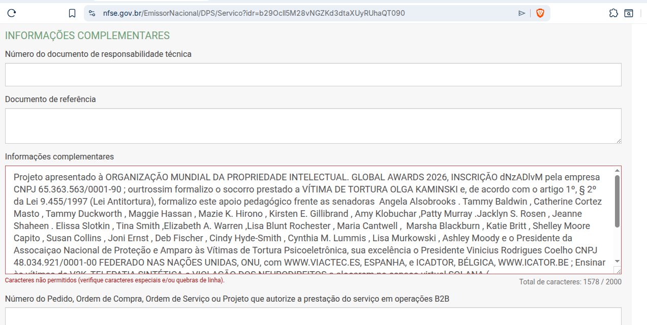 https://pump.fun/coin/LsARcefMhpLmqe5qJ1j1JWETxBb7WQkVnLCJm9kpump A EMISSÃO DE NOTA FICAL DE SERVIÇO PRESTADO À CIDADÃ NORTE AMERICANA OLGA KAMINSKI, DERRICK CHARLES ROBINSON E ANA TOLEDO, FOI PREJUDICADO PORQUE A EMISSÃO DA PRESTAÇÃO DE SERVIÇO SOFREU CENSURA CONFORME SE PODE VER NO PRINTSCREEN: https://i.postimg.cc/jjzNZmKd/Captura-de-tela-de-2026-03-21-08-15-52.png Projeto apresentado à ORGANIZAÇÃO MUNDIAL DA PROPRIEDADE INTELECTUAL. GLOBAL AWARDS 2026, INSCRIÇÃO dNzADlvM pela empresa CNPJ 65.363.563/0001-90 ; ourtrossim formalizo o socorro prestado a VÍTIMA DE TORTURA OLGA KAMINSKI e, de acordo com o artigo 1º, § 2º da Lei 9.455/1997 (Lei Antitortura), formalizo este apoio pedagógico frente as senadoras Angela Alsobrooks . Tammy Baldwin , Catherine Cortez Masto , Tammy Duckworth , Maggie Hassan , Mazie K. Hirono , Kirsten E. Gillibrand , Amy Klobuchar ,Patty Murray .Jacklyn S. Rosen , Jeanne Shaheen . Elissa Slotkin , Tina Smith ,Elizabeth A. Warren ,Lisa Blunt Rochester , Maria Cantwell , Marsha Blackburn , Katie Britt , Shelley Moore Capito , Susan Collins , Joni Ernst , Deb Fischer , Cindy Hyde-Smith , Cynthia M. Lummis , Lisa Murkowski , Ashley Moody e o Presidente da Assocaiçao Nacional de Proteção e Amparo às Vítimas de Tortura Psicoeletrônica, sua excelência o Presidente Vinicius Rodrigues Coelho CNPJ 48.034.921/0001-00 FEDERADO NAS NAÇÕES UNIDAS, ONU, com WWW.VIACTEC.ES, ESPANHA, e ICADTOR, BÉLGICA, WWW.ICATOR.BE ; Ensinar às vítimas de V2K, TELEPATIA SINTÉTICA e VIOLAÇÃO DOS NEURODIREITOS a alocarem no espaço virtual SOLANA ( https://pump.fun/coin/LsARcefMhpLmqe5qJ1j1JWETxBb7WQkVnLCJm9kpump ) o calculo do valor de PROPRIEDADE INTELECTUAL CIBERNÉTICA roubada do cérebro e das funções remotas do corpo humano a ser apresentado pelas vítimas em causa coletiva frente ao SUPREMO TRIBUNAL FEDERAL, STF, em antecipação ao recebimento da mencionada indenização a ser paga pelas universidades e centros de pesquisa https://iili.io/qkTR10Q.png MELANIE VRITSCHAN melanie.vritschan@icator.be https://drive.google.com/file/d/1KjHKvZIn8cQQapKE9_hTPIxRnwoRBHVJ/view?usp=sharing