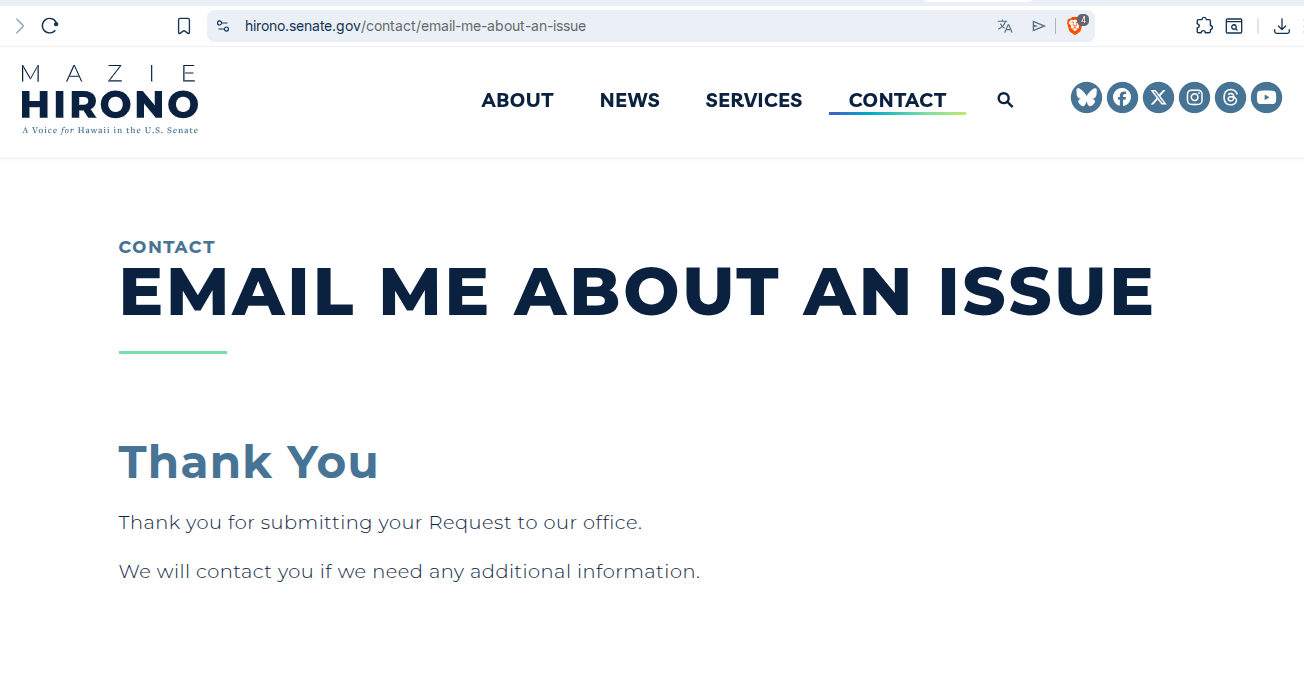 20006, USA. Have you contacted another office about this issue? YES. If so, which office(s)? MARSHA BLACKBURN; ALSOBROOKS ;BRITT; CANTWELL ;ERNST;ROCHESTER; RUTNIK ;CAPITO; MASTO; WARREN; SMITH; SLOTKIN; SHAHEEN; ROSEN; MURRAY,; MURKOWSKI;